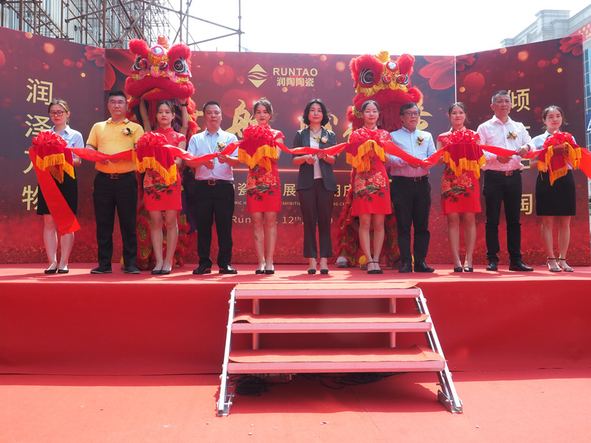 潤陶陶瓷董事長張愉,佛山陶瓷行業(yè)協(xié)會秘書長、華南理工大學(xué)教授尹虹、潤陶陶瓷營銷總經(jīng)理王志平等一行五人一同登臺剪彩,為潤陶總部展廳隆重揭幕,金剪一開,展開全新篇章。